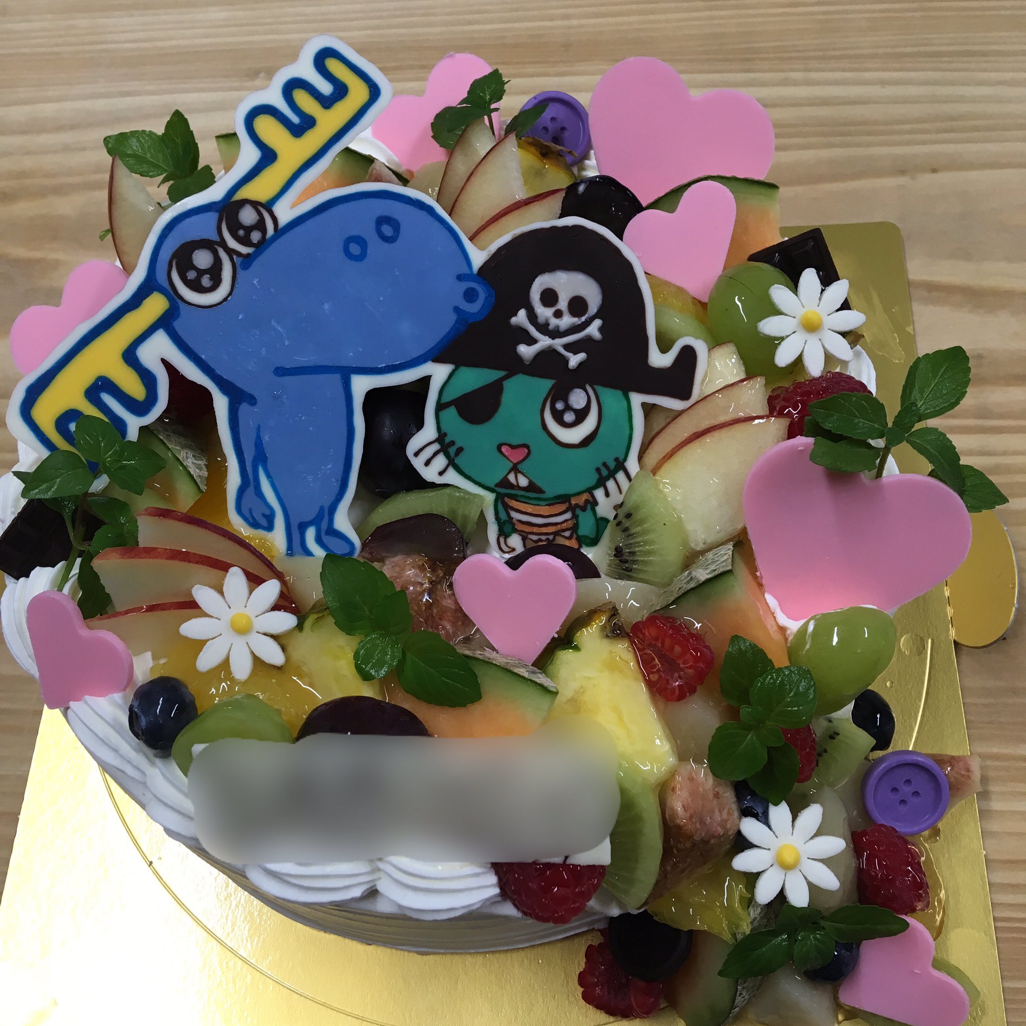 菓子工房シュクルリ 本日の特注ケーキ ハッピーツリーフレンズより ランピーとフリッピー 可愛いバージョン のイラストケーキ 7号 F21cm の大きなケーキに溢れるフルーツ盛りで グロくない可愛いタイプのハピツリイラストでした お誕生日